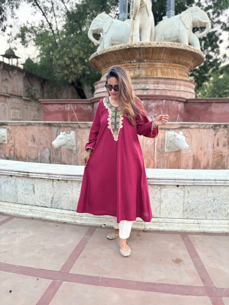 Embroidered Cotton Kurta with Lace Detailing on the Sleeves * Length : 48 inches