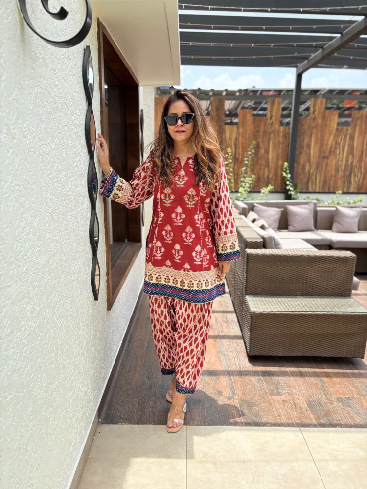 Cotton Co-ord Set with Embroidery, Patchwork and Gota Detailing. * Length : Kurta 34 inches Pants 37 inches