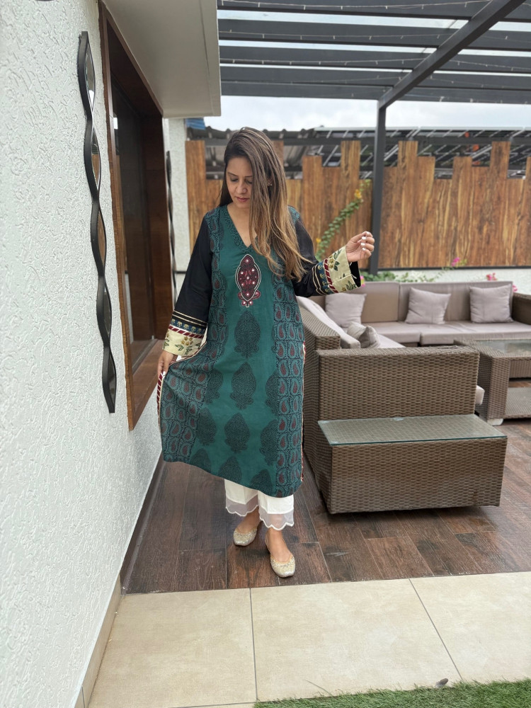 Handblock Printed Bagh Cotton Kurta with Patchwork and Embroidery. * Length : 48 inches