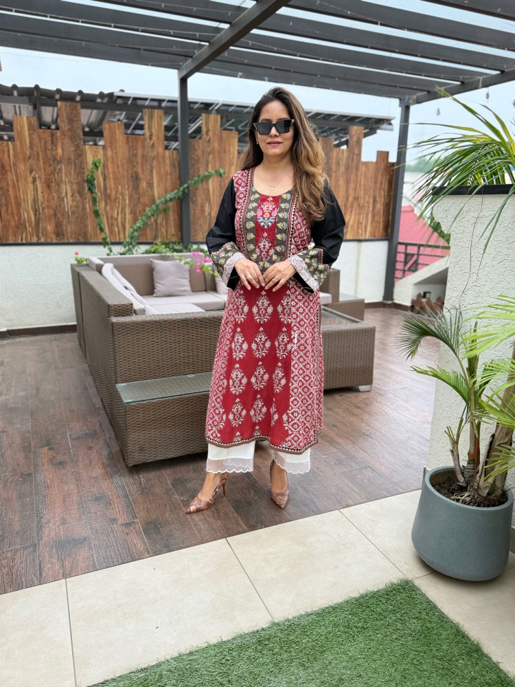 Handblock Printed Bagh Cotton Kurta with Patchwork and Embroidery * Length : 48 inches