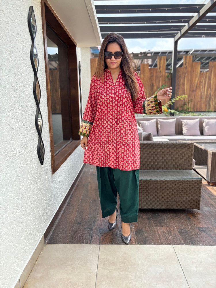 Handblock Printed Cotton Kurta with Patchwork and Lace Detailing. Comes with Cotton Salwar * Length : Kurta 34 inches. Pants : 37 inches