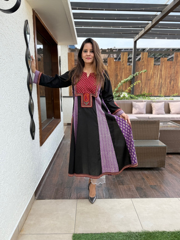 Handblock Printed Cotton Anarkali with Patchwork, Lace and Gota Detailing. * Length : 48 inches